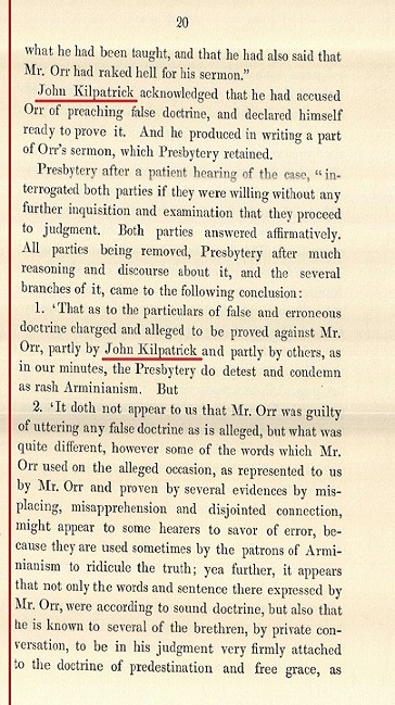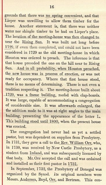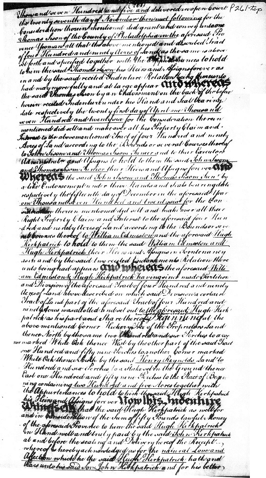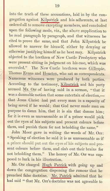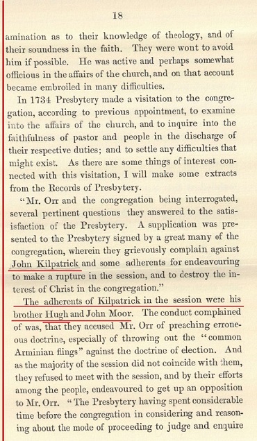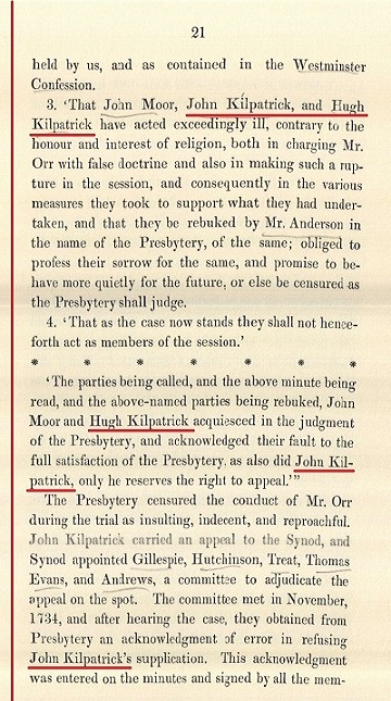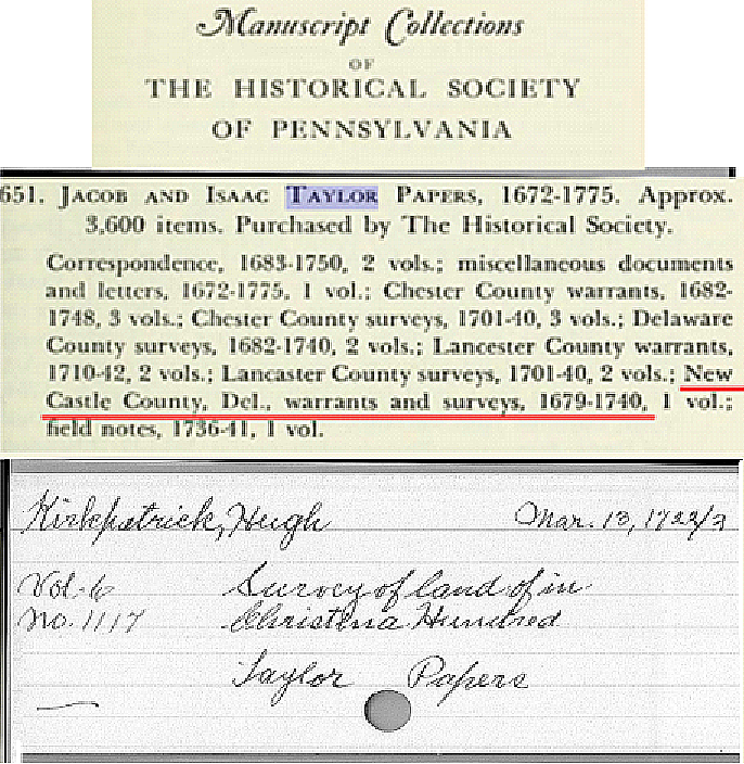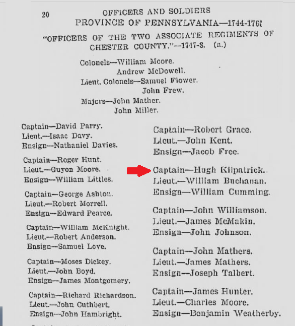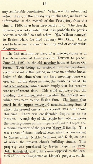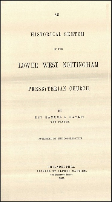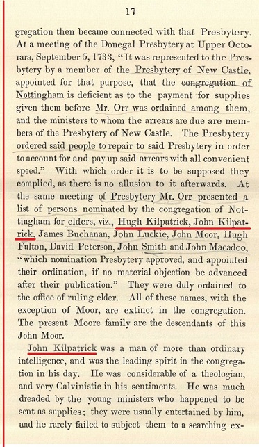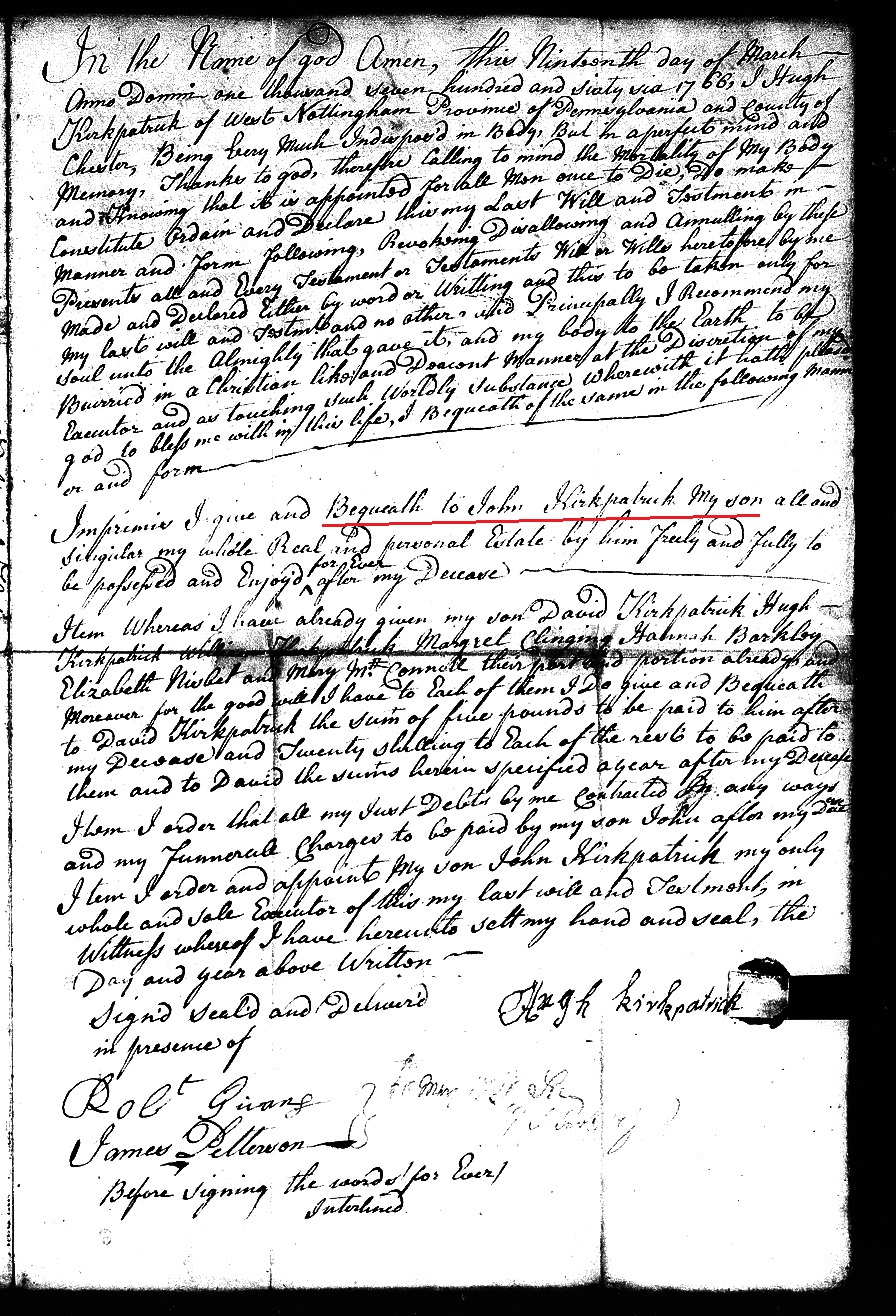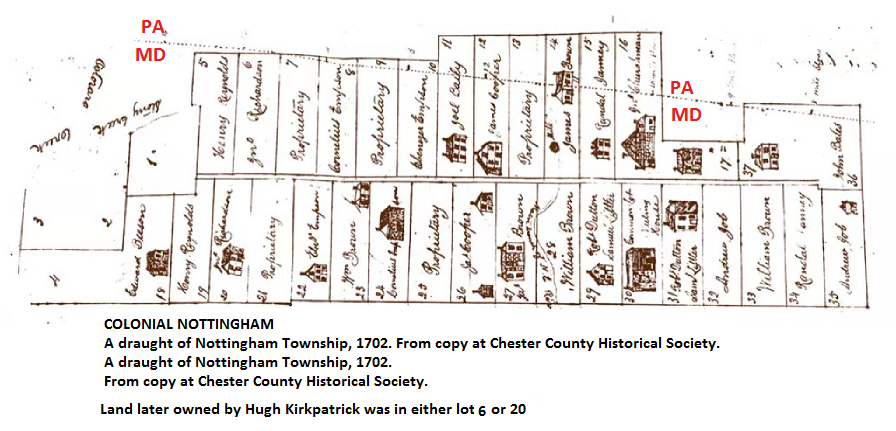 For all these years we assumed Hugh lived and died in West Nottingham Township of Chester Co., PA. The reality is that Hugh, and his brother John actually lived in the portion of Cecil Co., MD that was disputed territory, claimed by both Pennsylvania and Maryland. The actual "State Ownership" of this land was not settled until Mason and Dixon surveyed the border betwween MD and PA, AND it was confirmed by King George III. The first indication of the true location of their land came with the history of the Lower West Nottingham Presbyterian Church near Rising Sun, Cecil Co., MD. The book was written by the minsiter, Rev. Samuel A. Gayley, in 1865. (John and Hugh were refered to as "Kilpatrick," which was a common alternate spelling for Kirkpatrick at that time). The following pages give a lot of info on the Kirkpatrick brothers.