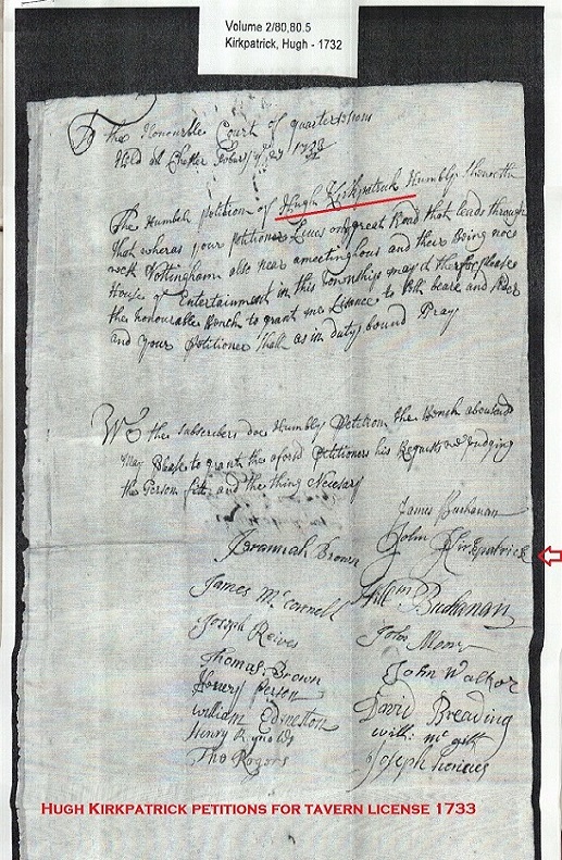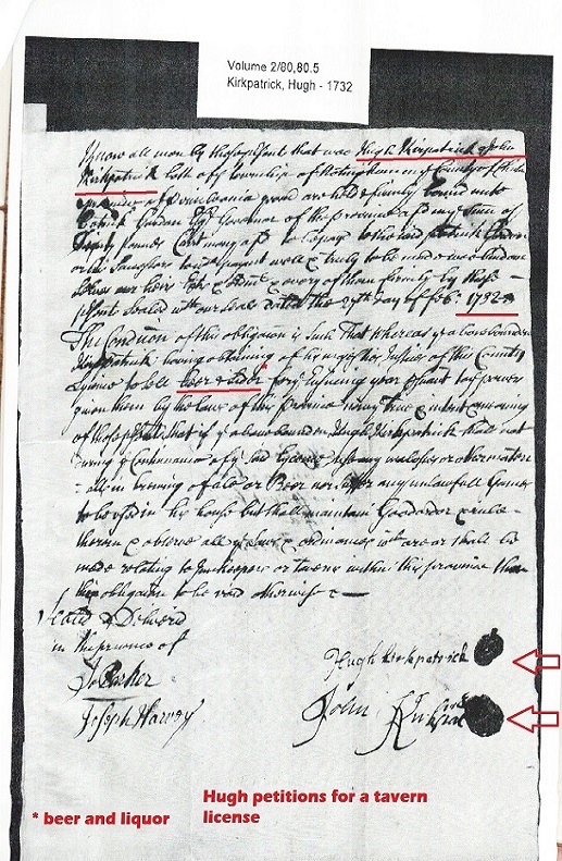 Hug also appears on a variety of other document and records. In 1732 Hugh petitioned for a license to operate a tavern on the "Great Road which runs through West Nottingham."