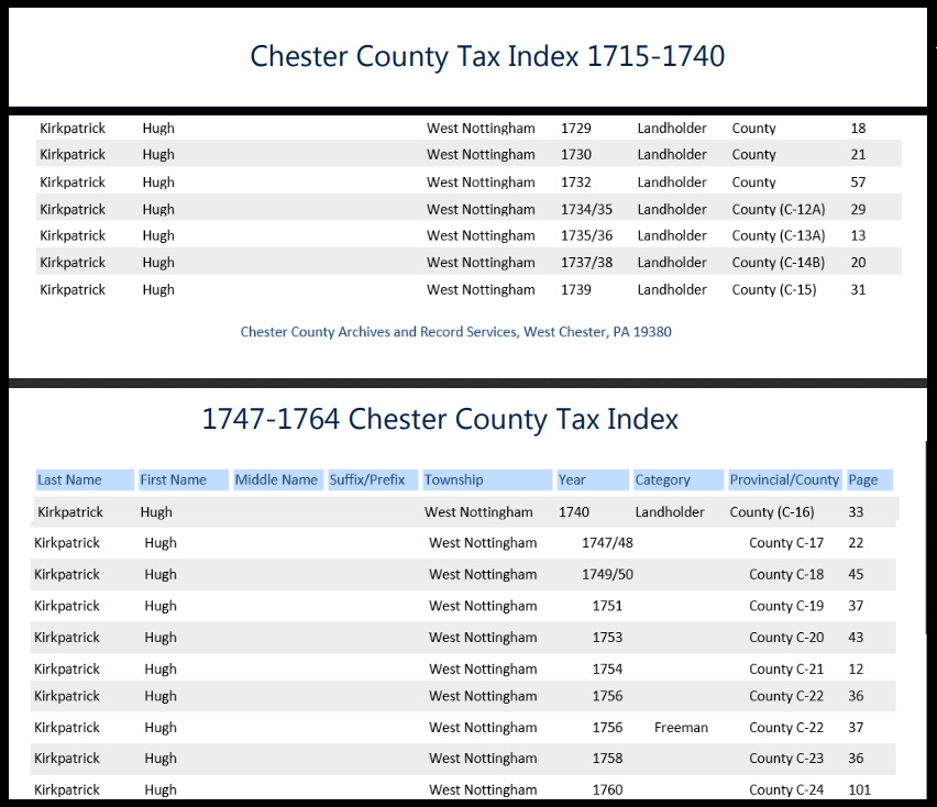 We next find Hugh on the 1729 tax list of West Nottingham Township, Cheester County, PA