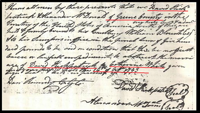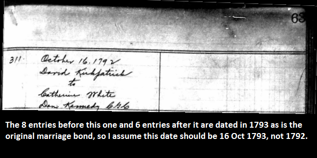 The earliest doument of David Kirkpatrick is his marriage to Catherine White in Greene County, TN dated 16 Oct., 1793.