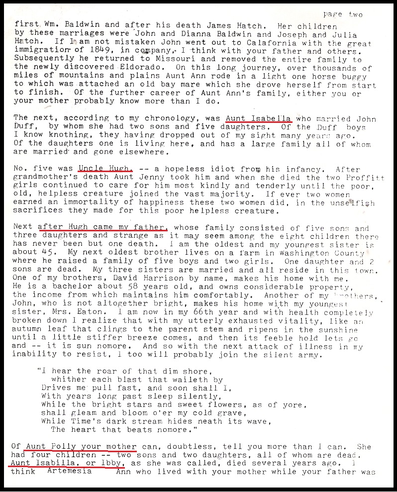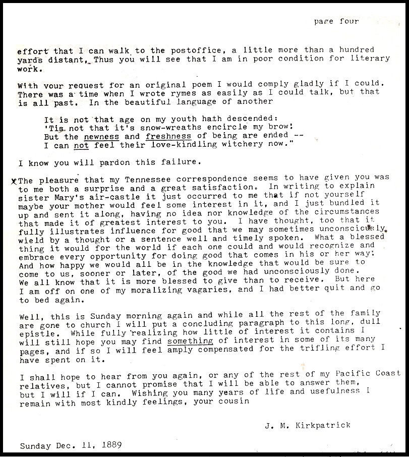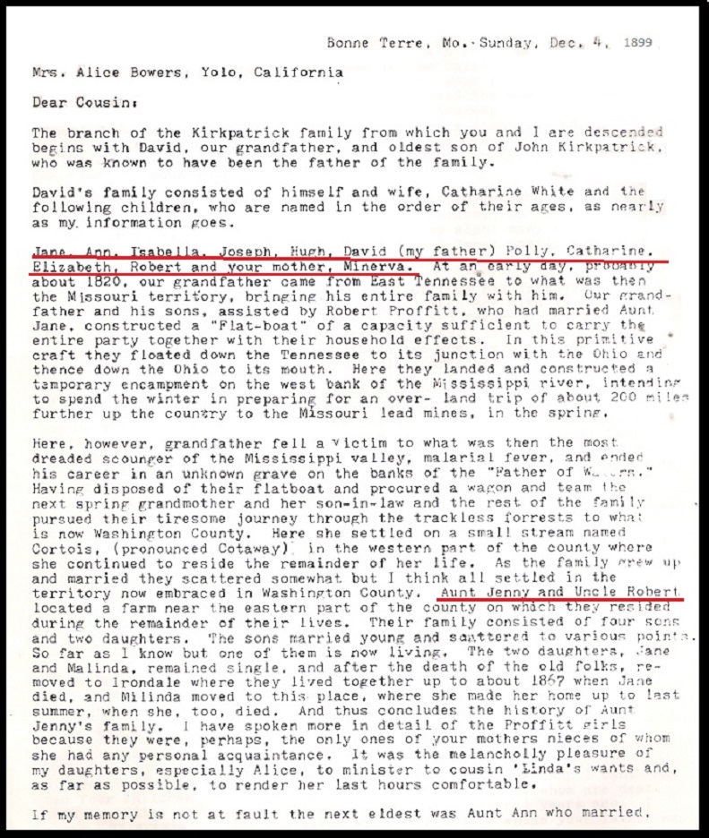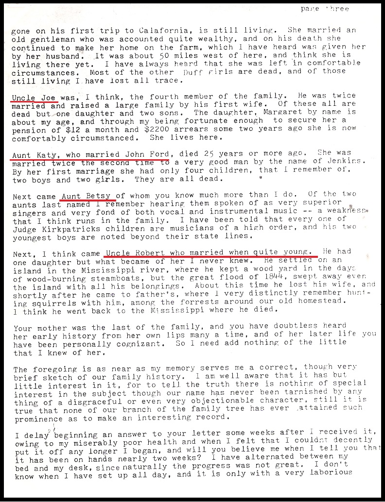 The next source of information comes from a typed copy of a letter written to Alice Bowers by J. M. Kirkpatrick (presumably James M Kirkpatrick son of David) in 1899. Although not an actual document, the letter was written by a grandson of Catherine (White) and David S. Kirkpatrick and based on his firsthand knowledge of the family.