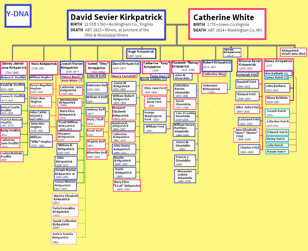 Family tradition tells us that some time before 1822 David packed his family and their belongings on a flatboat and headed down the Holston River to the Tennessee River to the Ohio Riven to the Mississippi Riverwith the ultimate goal of settling in Washington County, Missouri. This same story continues to tell us that, whild camped at the mouth of the Ohio River, David Sevier Kirkpatrick contracted malaria and died. Chatherine, David's wife, continues on with her children arriving in Washington County some time before August 29, 1822 when William Hughes married Mary Kirkpatrick, David and Catherine (White) Kirkpatrick's daughter. The record of this marriage is found only in William Hughes's family Bible.