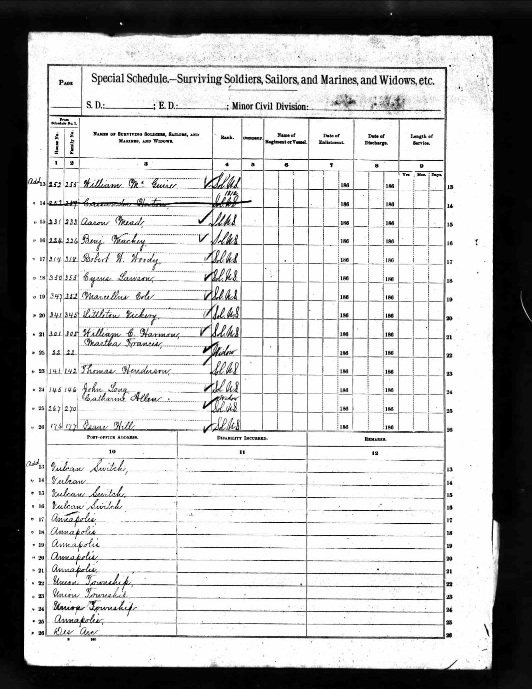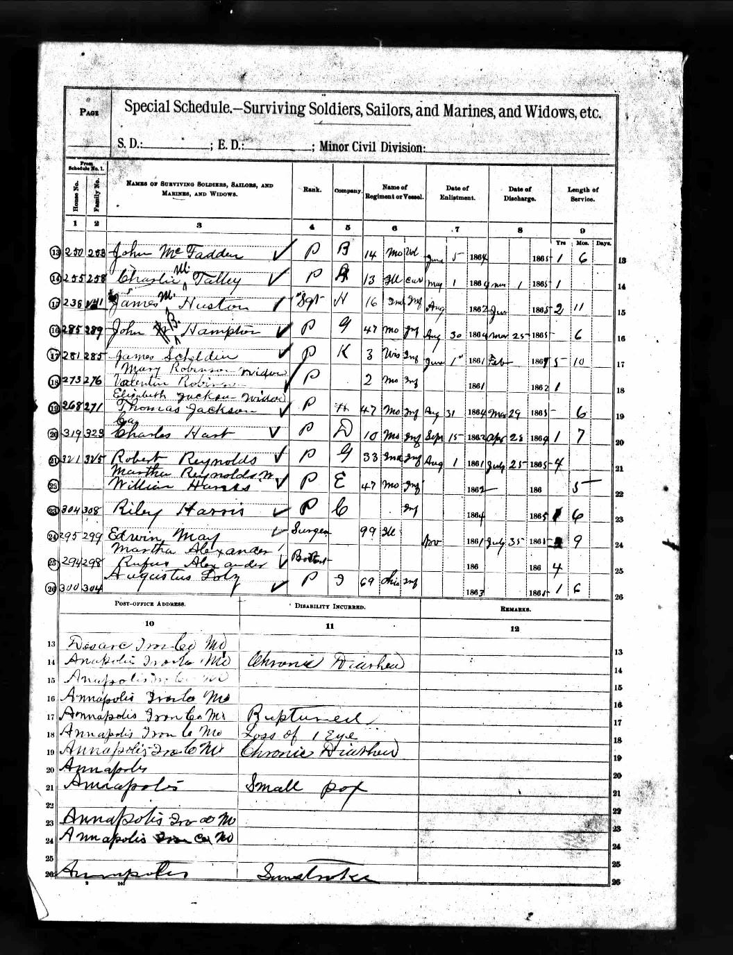 This alphabetical list has been reworked to include ALL NAMES, even those that were struck out on the original documents. Several names were found to have been omitted from the original list, and have been added. The names of Widows and of their deceased husbands are listed separately. Spellings of names have been checked, and some have been changed from the original list (interpreting 19th century writing is somewhat subjective, at best). When an exact spelling cannot be determined, alternate spellings have been put in parenthesis followed by question marks. ( ???)