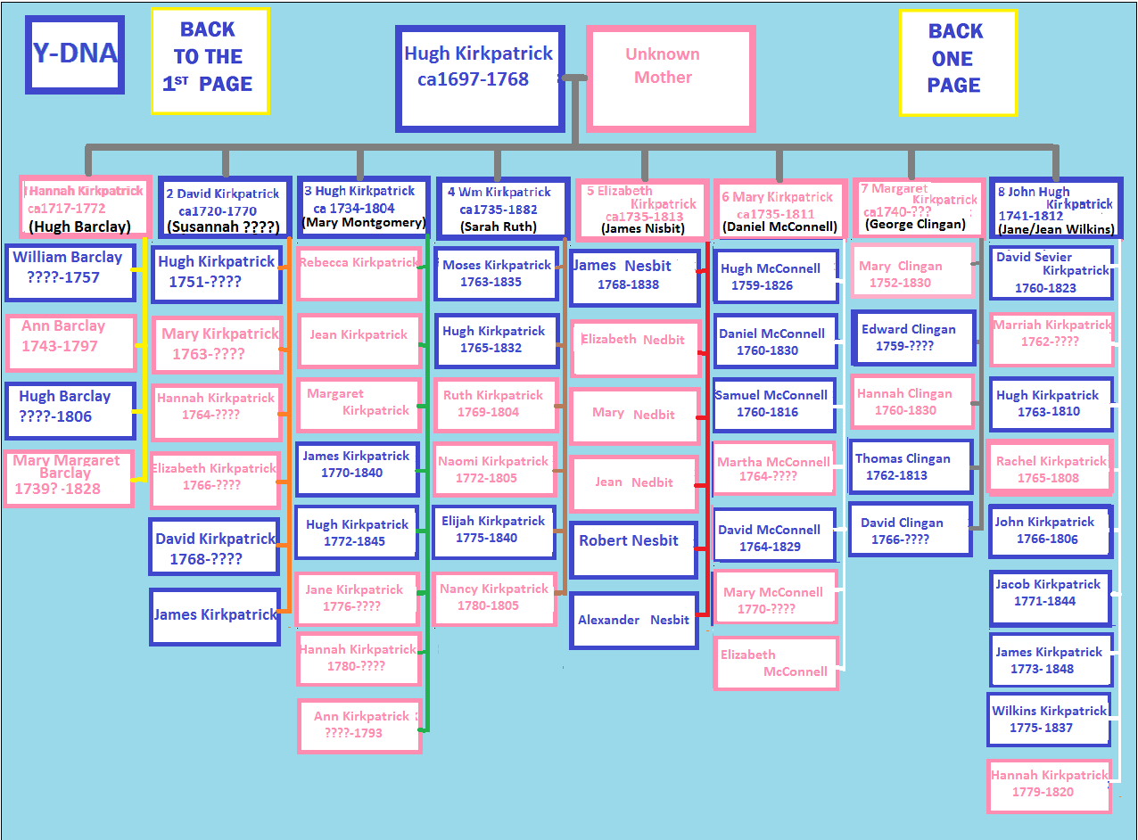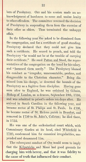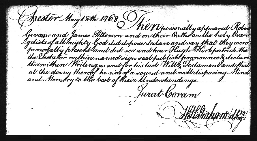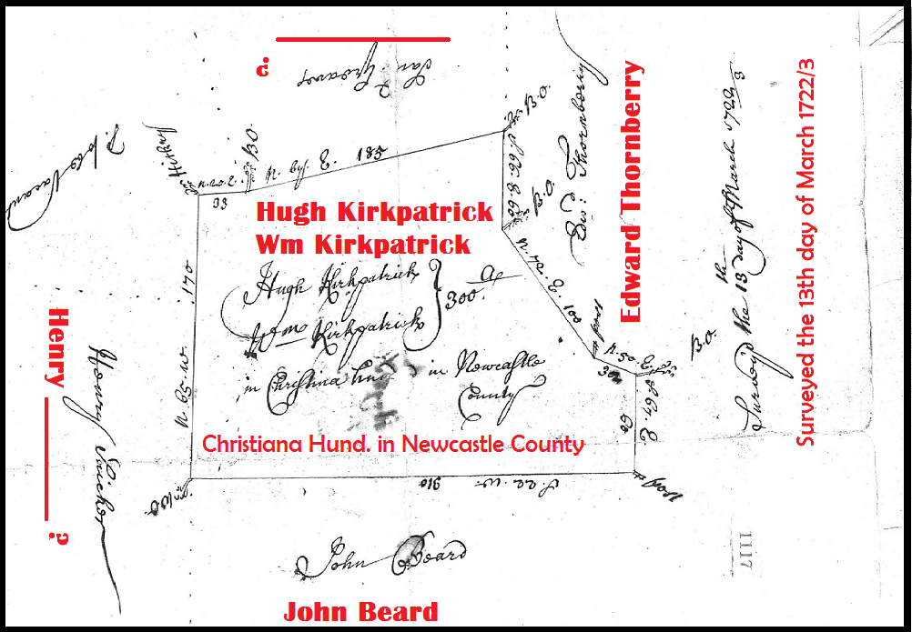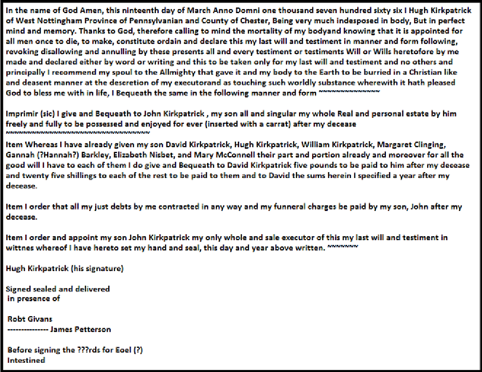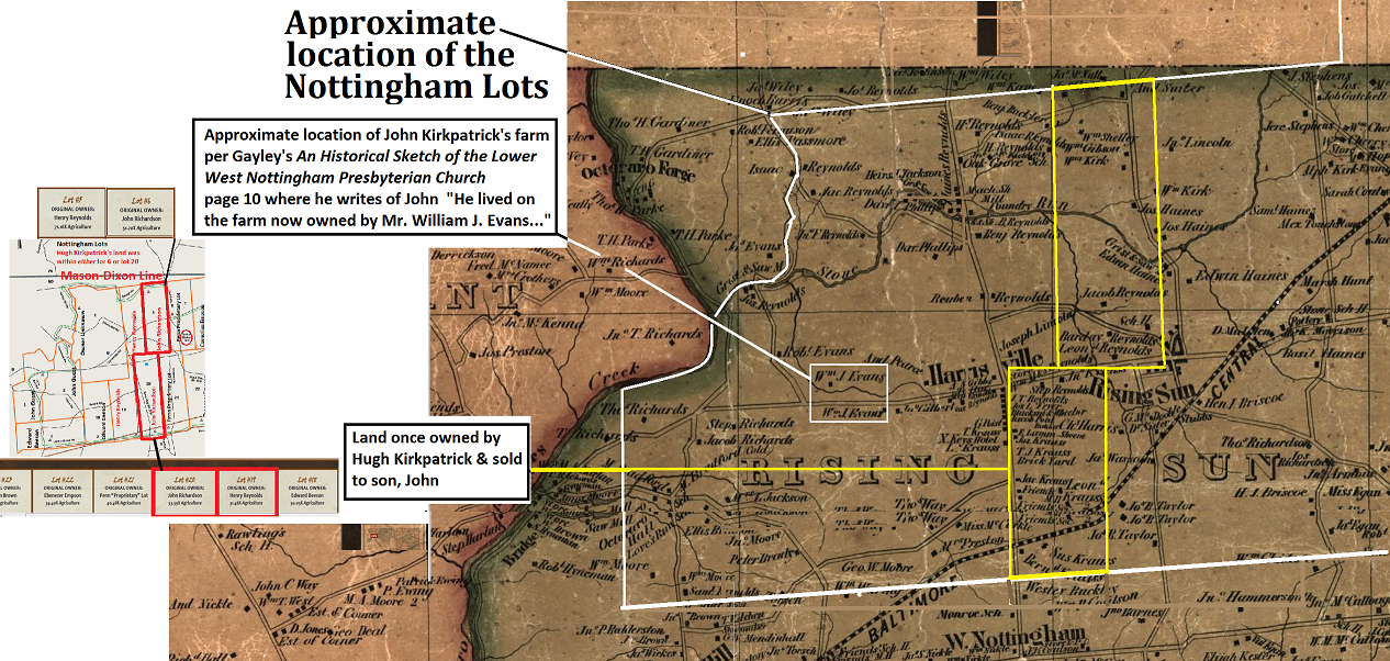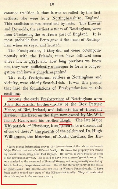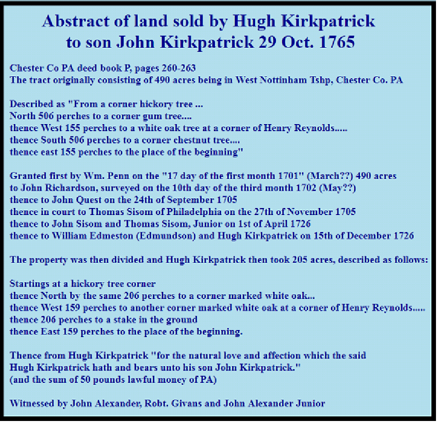 For all these years we assumed Hugh lived and died in West Nottingham Township of Chester Co., PA. The reality is that Hugh, and his brother John actually lived in the portion of Cecil Co., MD that was disputed territory, claimed by both Pennsylvania and Maryland. The actual "State Ownership" of this land was not settled until Mason and Dixon surveyed the border betwween MD and PA, AND it was confirmed by King George III. The first indication of the true location of their land came with the history of the Lower West Nottingham Presbyterian Church near Rising Sun, Cecil Co., MD. The book was written by the minsiter, Rev. Samuel A. Gayley, in 1865. (John and Hugh were refered to as "Kilpatrick," which was a common alternate spelling for Kirkpatrick at that time). The following pages give a lot of info on the Kirkpatrick brothers.