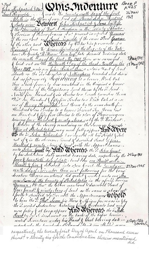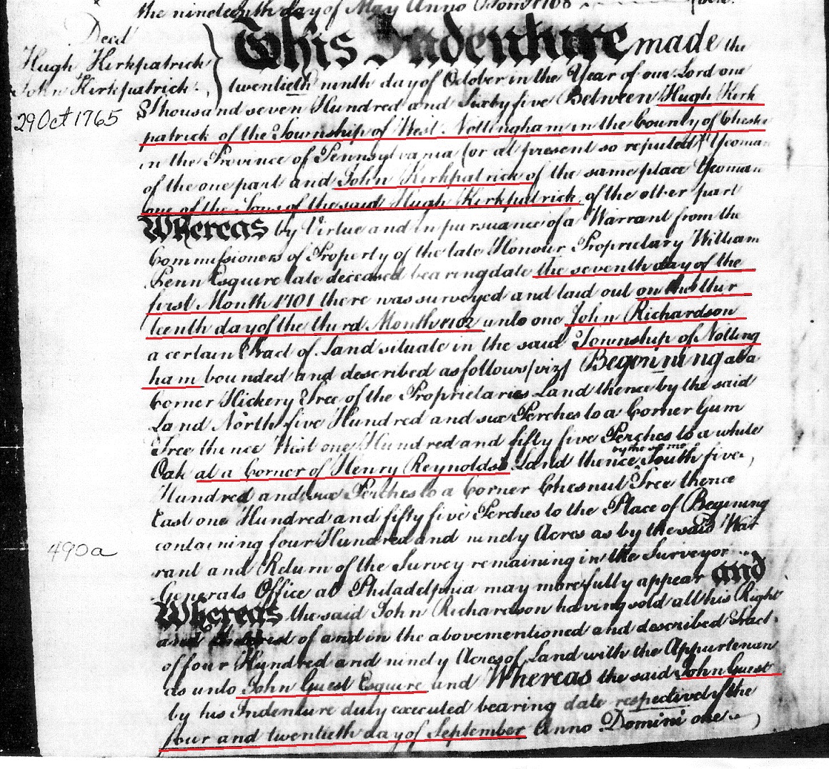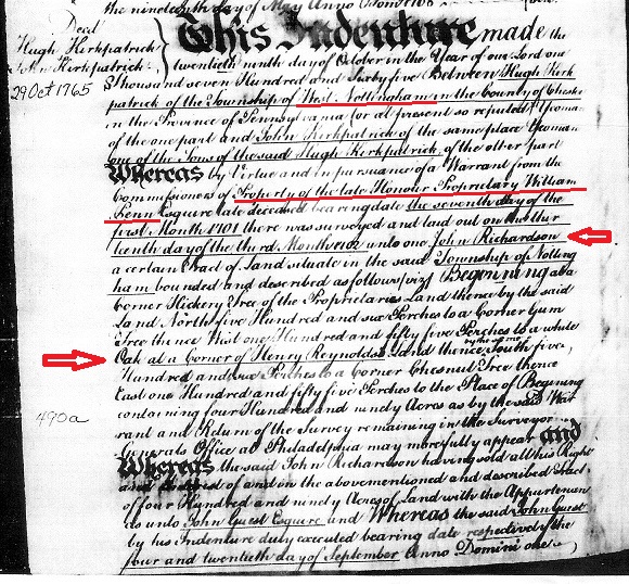 Later I read a deed from Hugh to his son John, this land had once belonged to John Richardson and was bordered by Henry Reynolds. Both of these men were original owners of 2 of the Nottingham Lots