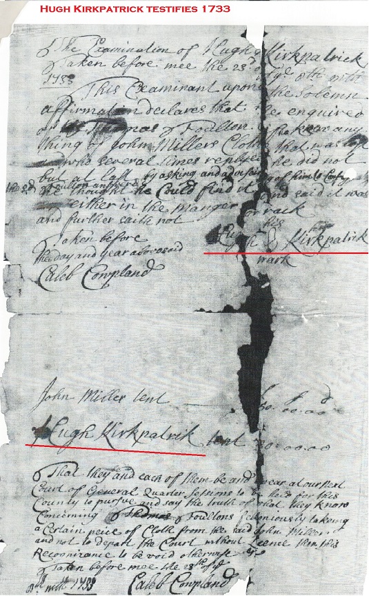 In 1733 Hugh testified in a ccourt case concerning a stolen bolt of cloth.